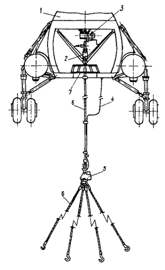 азимутальной ориентации груза в пространстве: 1 - траверса системы ориентации; 2 - электрозамок; 3 - паук внешней подвески; 4 - крюк внешней подвески вертолета; 5 - жесткая стабилизирующая тяга; 6 - канаты с амортизаторами; 7 - фиксатор; 8 - тросик фиксатора; 9 - фиксирующие диски 6.12. Во избежание поражения статическим