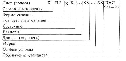 при следующих сокращениях: Способ изготовления: горячекатаный – Г; холоднокатаный – Д; Форма сечения: прямоугольный (ая) – ПР. Точность изготовления (для полос): нормальная по толщине и ширине – Н; повышенная по толщине и ширине – П; нормальная по толщине и повышенная по ширине – К; повышенная по толщине и нормальная по ширине – И. Точность изготовления по длине холоднокатаных листов: нормальная – Н; повышенная – П; высокая – В. Состояние: мягкое – М; полутвердое – П; твердое – Т; особотвердое – О. Длина (мерность): немерная – НД; мерная – МД; кратная мерной – КД. Особые условия: антимагнитная – АМ. Мерность указывается только для полос. Вместо отсутствующих данных ставится знак Х, кроме обозначения длины (мерности) и особых условий. Примеры условных обозначений: Лист горячекатаный размером 5´600´1500 мм из латуни марки Л63: Лист
