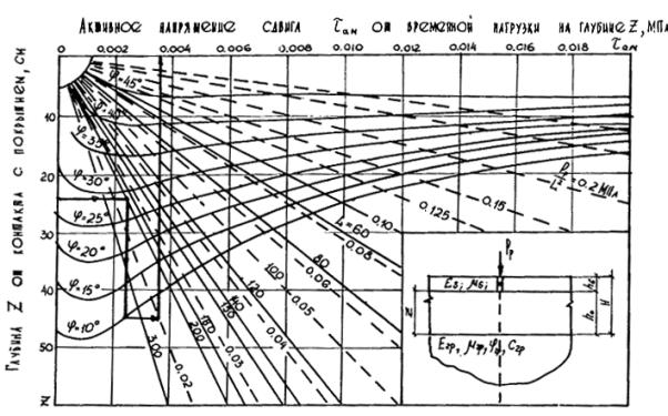 основание - песок мелкий. L = 1,07 (упругая характеристика не изменится), z = 0,5 м, По номограмме (см. рис. 7) для новых исходных данных tам = 0,090 МПа. Предельное