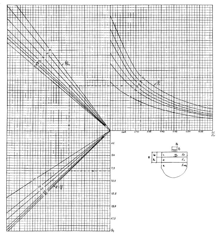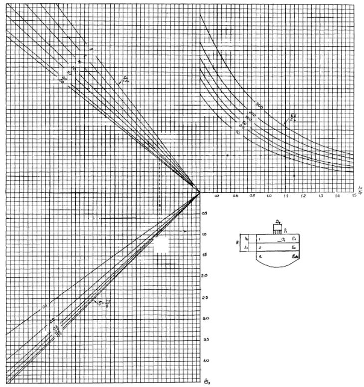 неограниченной в плане плиты на упругом двухслойном основании (hб/Dр = 0,20 ¸ 0,60): 1 - бетонное покрытие; Еб,