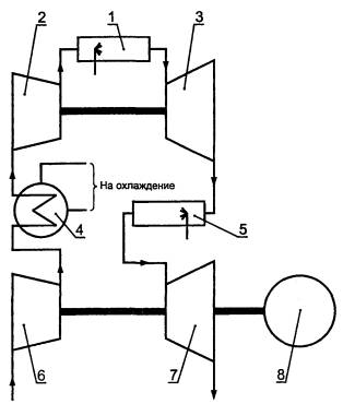 Рисунок А.4 - Схема ГТУ с многовальным ГТД сложного цикла (с промежуточным охлаждением и промежуточным подогревом). 1 - основная камера сгорания; 2 - компрессор высокого давления; 3 - турбина высокого давления; 4 - промежуточный охладитель; 5 - камера сгорания промежуточного