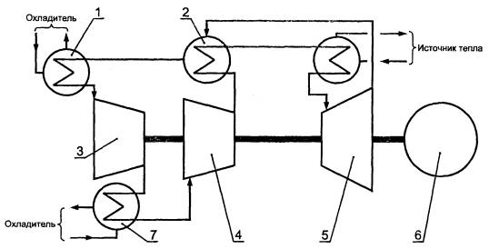 Рисунок А.5 - Схема ГТУ с одновальным ГТД с отборами воздуха и горячего газа. 1 - камера сгорания; 2 - компрессор; 3 - турбина; 4 - нагрузка. Рисунок А.6 - Схема ГТУ с одновальным ГТД замкнутого цикла. 1 - предварительный охладитель; 2 - подогреватель рабочего тела; 3 - компрессор низкого давления; 4 - компрессор высокого давления; 5 - турбина; 6 - нагрузка; 7 -