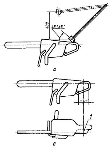должна проходить через точку удара В под углом 45° ± 5° вперед и вниз к оси