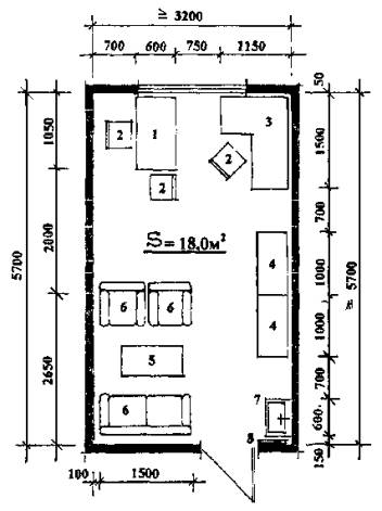 ЭКСПЛИКАЦИЯ ОБОРУДОВАНИЯ 1. СТОЛ СПЕЦИАЛИСТА 2. СТУЛ 3. СТОЛ ДЛЯ КОМПЬЮТЕРА 4. ШКАФ-СТЕЛЛАЖ 5. ЖУРНАЛЬНЫЙ СТОЛ 6. МЯГКАЯ МЕБЕЛЬ 7. УМЫВАЛЬНИК 8. ВЕШАЛКА ДЛЯ ПОЛОТЕНЦА РИС. П.1. КАБИНЕТ СПЕЦИАЛИСТА (ПСИХОЛОГА, ЮРИСТА ПО ВОССТАНОВЛЕНИЮ