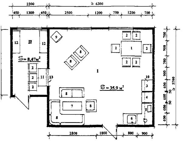 ЭЛЕКТРОЧАЙНИКОМ 6. РАКОВИНА 7. ЖУРНАЛЬНЫЙ СТОЛИК 8. МЯГКАЯ МЕБЕЛЬ 9. ТЕЛЕВИЗОР 10. НАВЕСНЫЕ ПОЛКИ ДЛЯ ПОСУДЫ II. ЛАБОРАНТСКАЯ 2. СТУЛ 11. СТОЛ СПЕЦИАЛИСТА 12. ШКАФ-СТЕЛЛАЖ 13. ЗЕРКАЛО ГЕЗЕЛЛА РИС. П.2. ПОМЕЩЕНИЕ РОДИТЕЛЬСКОГО
