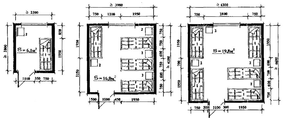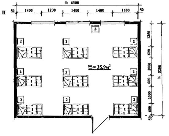 I. СПАЛЬНЯ НА 1 МЕСТО II. СПАЛЬНЯ НА 9 МЕСТ ЭКСПЛИКАЦИЯ ОБОРУДОВАНИЯ 1. КРОВАТЬ 2. ДЕТСКИЙ СТУЛ 3. СТУЛ ДЛЯ ВОСПИТАТЕЛЯ РИС. П.3. ПРИМЕРЫ ПЛАНИРОВКИ СПАЛЕН НА 1 И 9