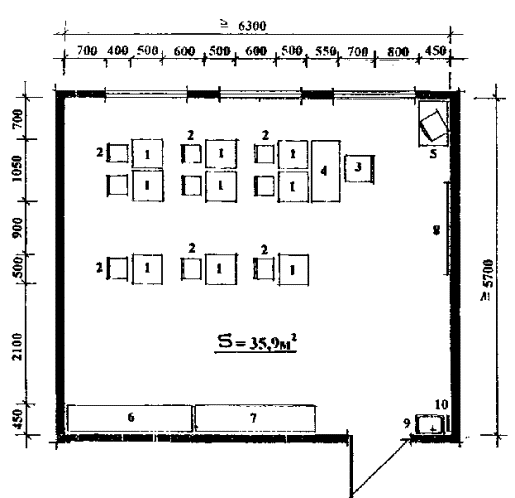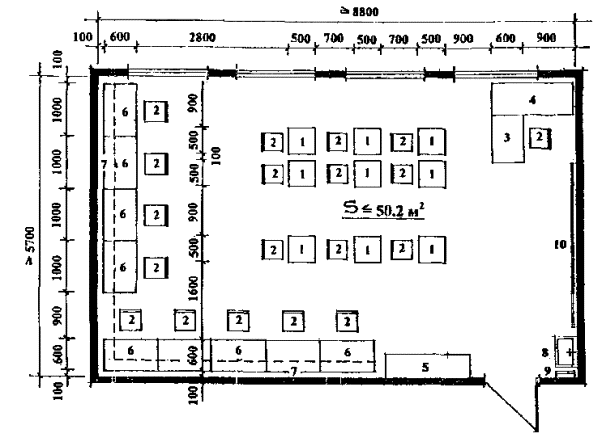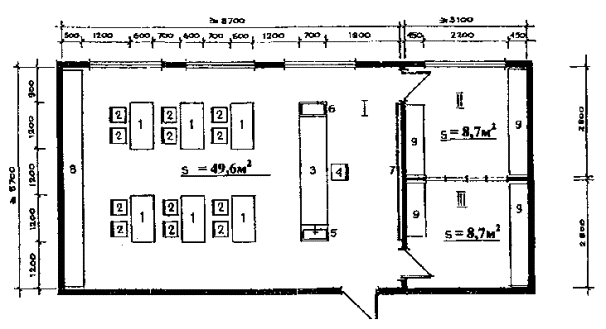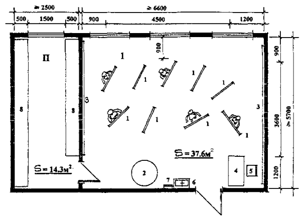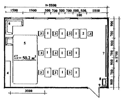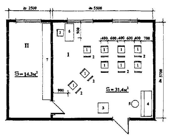 - ЛАБОРАНТСКИЕ 9. ШКАФ - СТЕЛЛАЖ РИС. П.8. КАБИНЕТ ДЛЯ ЗАНЯТИЙ ФИЗИКОЙ И ХИМИЕЙ (I) С ЛАБОРАНТСКИМИ (II) И (III) ЭКСПЛИКАЦИЯ ОБОРУДОВАНИЯ 1. СТОЛ 2. СТУЛ 3. СТОЛ СПЕЦИАЛИСТА 4. СТОЛ ДЛЯ СЕРВЕРА (ЦЕНТРАЛЬНОГО ПРОЦЕССОРА) 5. ШКАФ - СТЕЛЛАЖ 6. СТОЛ ДЛЯ КОМПЬЮТЕРА (ТЕРМИНАЛА) 7. ПОЛКИ ПОДВЕСНЫЕ 8. УМЫВАЛЬНИК 9. ВЕШАЛКА ДЛЯ ПОЛОТЕНЦА 10. КЛАССНАЯ ДОСКА РИС. П.9. КОМПЬЮТЕРНЫЙ КЛАСС ЭКСПЛИКАЦИЯ ОБОРУДОВАНИЯ I. ИЗОСТУДИЯ 1. МОЛЬБЕРТ 2. ПОМОСТ ДЛЯ МОДЕЛЕЙ 3. ВЫСТАВКА РИСУНКОВ И КАРТИН 4. СТОЛ ПРЕПОДАВАТЕЛЯ 5. СТУЛ ПРЕПОДАВАТЕЛЯ 6. УМЫВАЛЬНИК 7. ВЕШАЛКА ДЛЯ ПОЛОТЕНЦА II. КЛАДОВАЯ 8. КОМБИНИРОВАННЫЙ ШКАФ РИС. П.10. КЛАСС РИСОВАНИЯ -