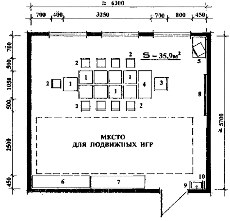 ЭКСПЛИКАЦИЯ ОБОРУДОВАНИЯ 1. СТОЛ УЧЕНИЧЕСКИЙ 2. СТУЛ ДЕТСКИЙ 3. СТУЛ 4. СТОЛ ВОСПИТАТЕЛЯ - ПЕДАГОГА 5. СТЕЛЛАЖ С ВИДЕОАППАРАТУРОЙ 6. СТЕЛЛАЖ 7. ЖИВОЙ УГОЛОК 8. УЧЕНИЧЕСКАЯ ДОСКА 9. УМЫВАЛЬНИК 10. ВЕШАЛКА ДЛЯ ПОЛОТЕНЦА РИС. П.4. ВАРИАНТЫ ПЛАНИРОВКИ ГРУППОВОЙ КОМНАТЫ ДЛЯ ДЕТЕЙ МЛАДШЕГО