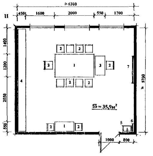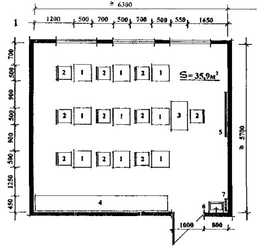 ЗАНЯТИЙ (1) С КЛАДОВОЙ ИНСТРУМЕНТОВ (П) ЭКСПЛИКАЦИЯ ОБОРУДОВАНИЯ 1. СТОЛ 2. СТУЛ 3. СТОЛ СПЕЦИАЛИСТА 4. КРЕСЛО 5. ШКАФ-СТЕЛЛАЖ 6. УМЫВАЛЬНИК 7. ВЕШАЛКА ДЛЯ ПОЛОТЕНЦА РИС. П.14. КАБИНЕТ ГРУППОВОЙ