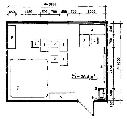 ПСИХОТЕРАПИИ НА 9 ЧЕЛОВЕК ЭКСПЛИКАЦИЯ ОБОРУДОВАНИЯ 1. СТОЛ 2. СТУЛ 3. СТОЛ СПЕЦИАЛИСТА 4. СТОЛ ДЛЯ КОМПЬЮТЕРА 5. УМЫВАЛЬНИК 6. ВЕШАЛКА ДЛЯ ПОЛОТЕНЦА 7. УГОЛОК РЕЛАКСАЦИИ 8. УЧЕНИЧЕСКАЯ ДОСКА 9. ШКАФ - СТЕЛЛАЖ РИС. П.15. КАБИНЕТ