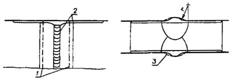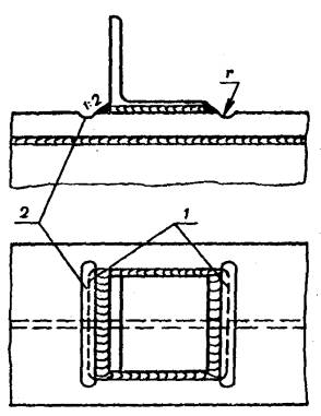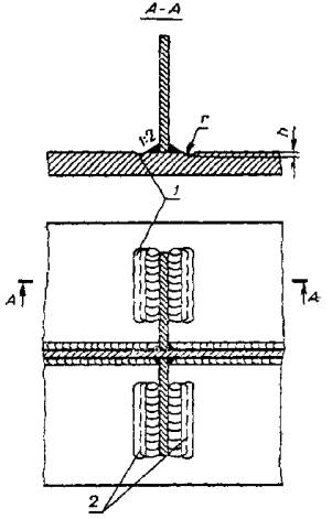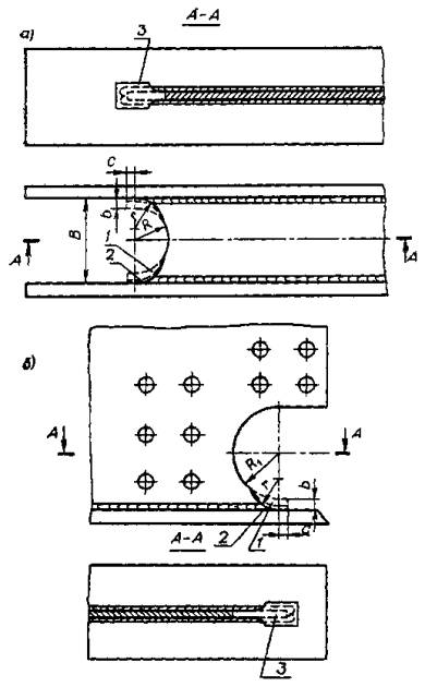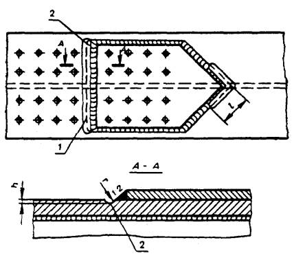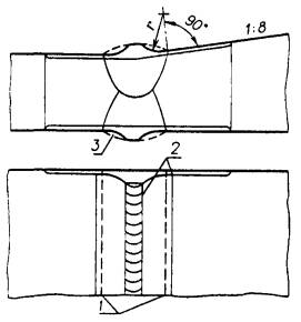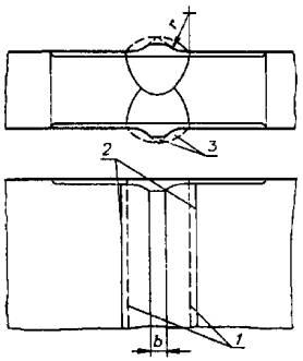 стыкового соединения листов одинаковой толщины без снятия усиления: 1 - граница шва; 2 - граница зоны механической обработки; 3 - металл, удаляемый при обработке; r - радиус перехода (r ³ 15 мм) Рис. 2. Схема зачистки