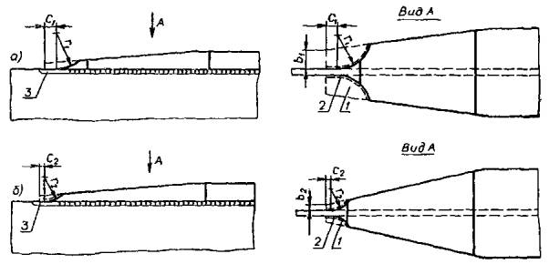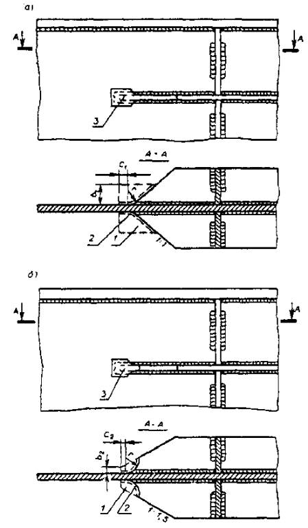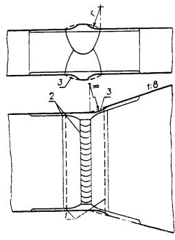 стыкового соединения листов разной толщины: 1 - граница шва; 2 - граница зоны механической обработки; 3 - металл,