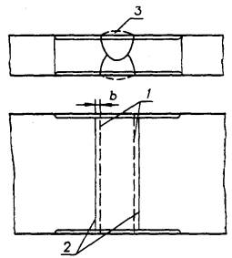 4. Схема обработки стыкового соединения листов разной ширины: 1 - граница шва; 2 - граница зоны механической обработки; 3 - металл,