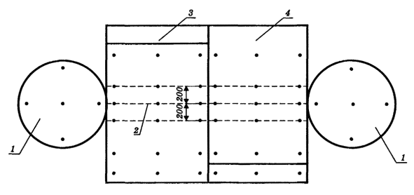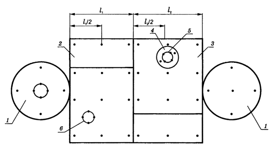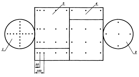 измерения толщин в горизонтальных сосудах, недоступных для внутреннего осмотра: 1 - днища; 2 -