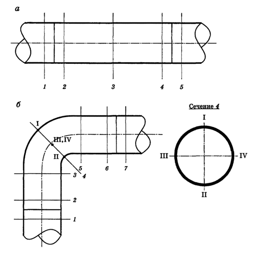 измерения толщин стенок трубопроводов: а - на прямолинейных участках; б - на гибах; I, II, III, IV - точки, в которых