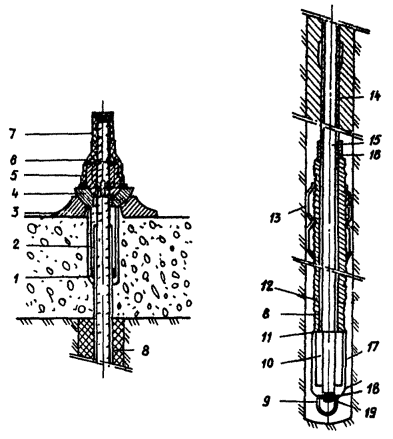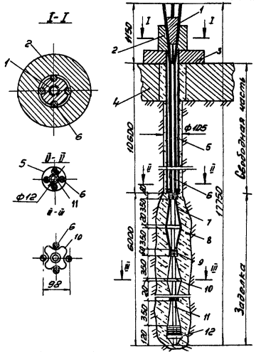 антикоррозионная масса; 5 - тяга; 6 - пакер; 7 - заделка (корень); 8 -
