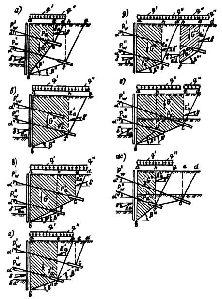 нижнего анкера могут исходить две линии скольжения вf и вfс (см. чертеж, г). Для